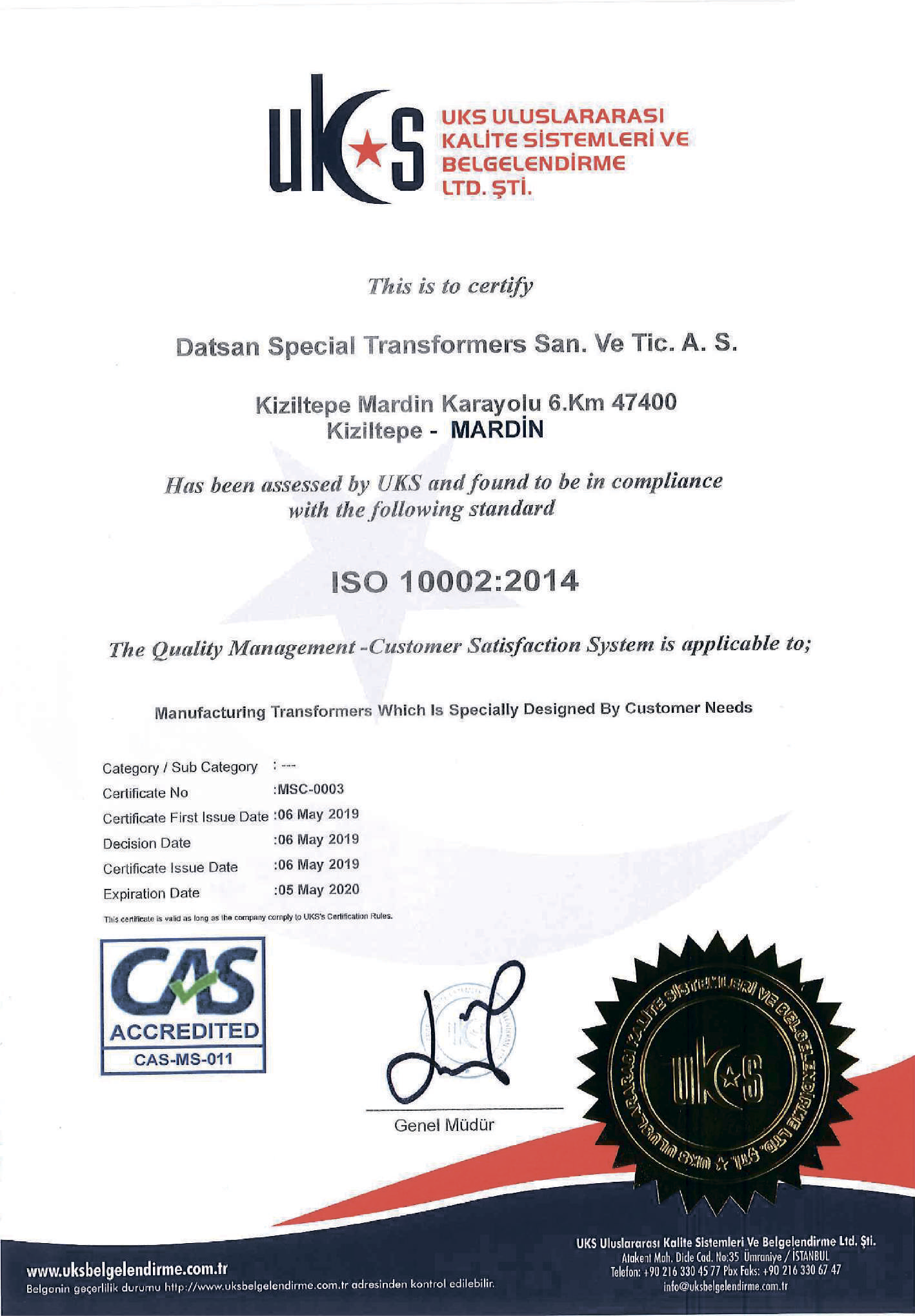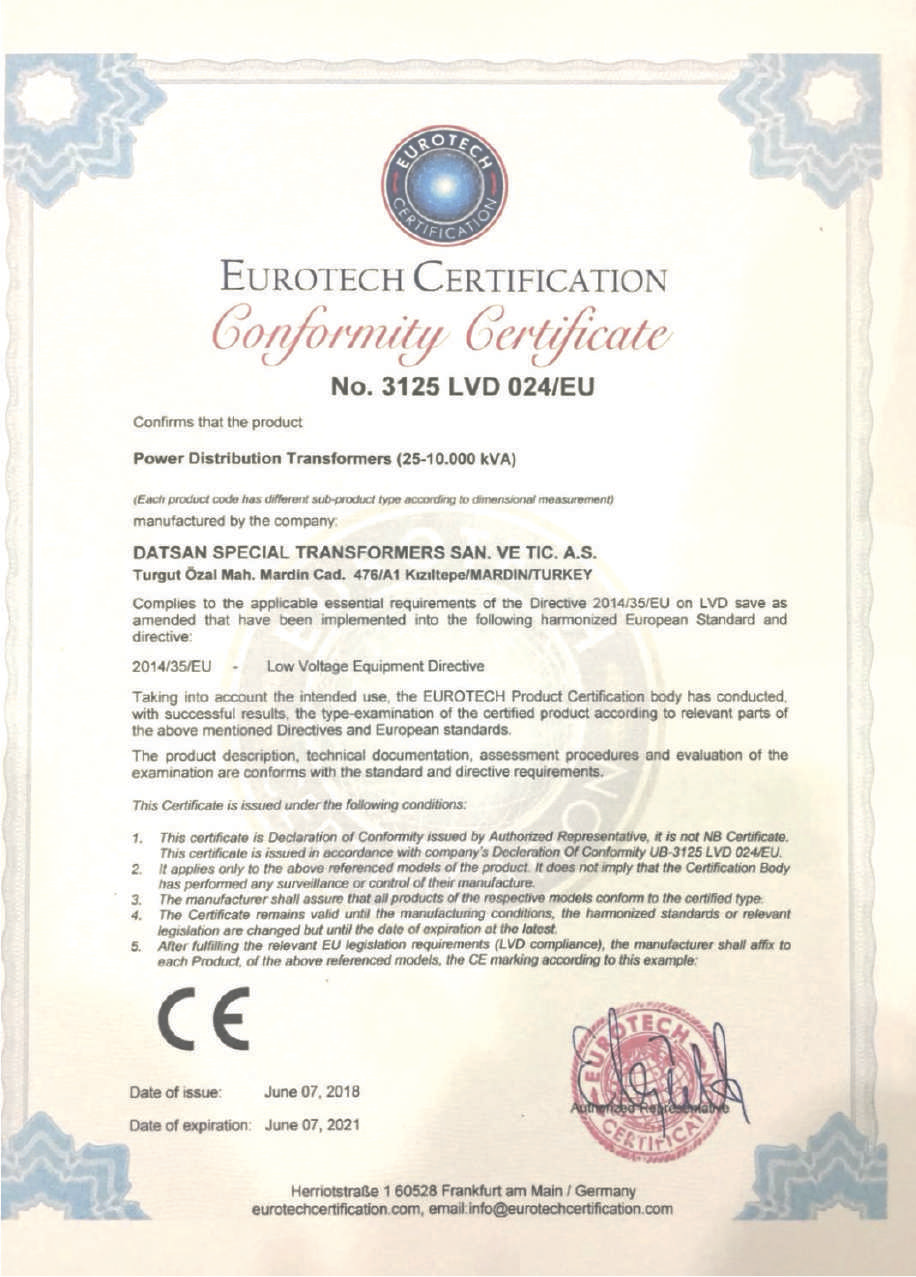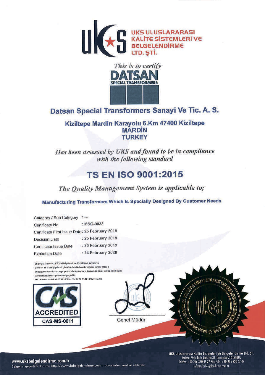 All Datsan Special Transformers products are designed in accordance with IEC, CE, ANSI, NEMA standards together with Customers’ requirements and needs. We’re proud to be a certified manufacturer that has its own vision and individual approach to each and every project.